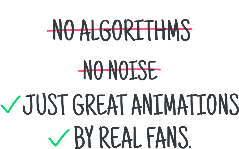 Unlike other platforms that rely on algorithms and keywords, we handpick amazing movies and curate special playlists, making sure your animation gets the attention it deserves, instead of fading into the background.