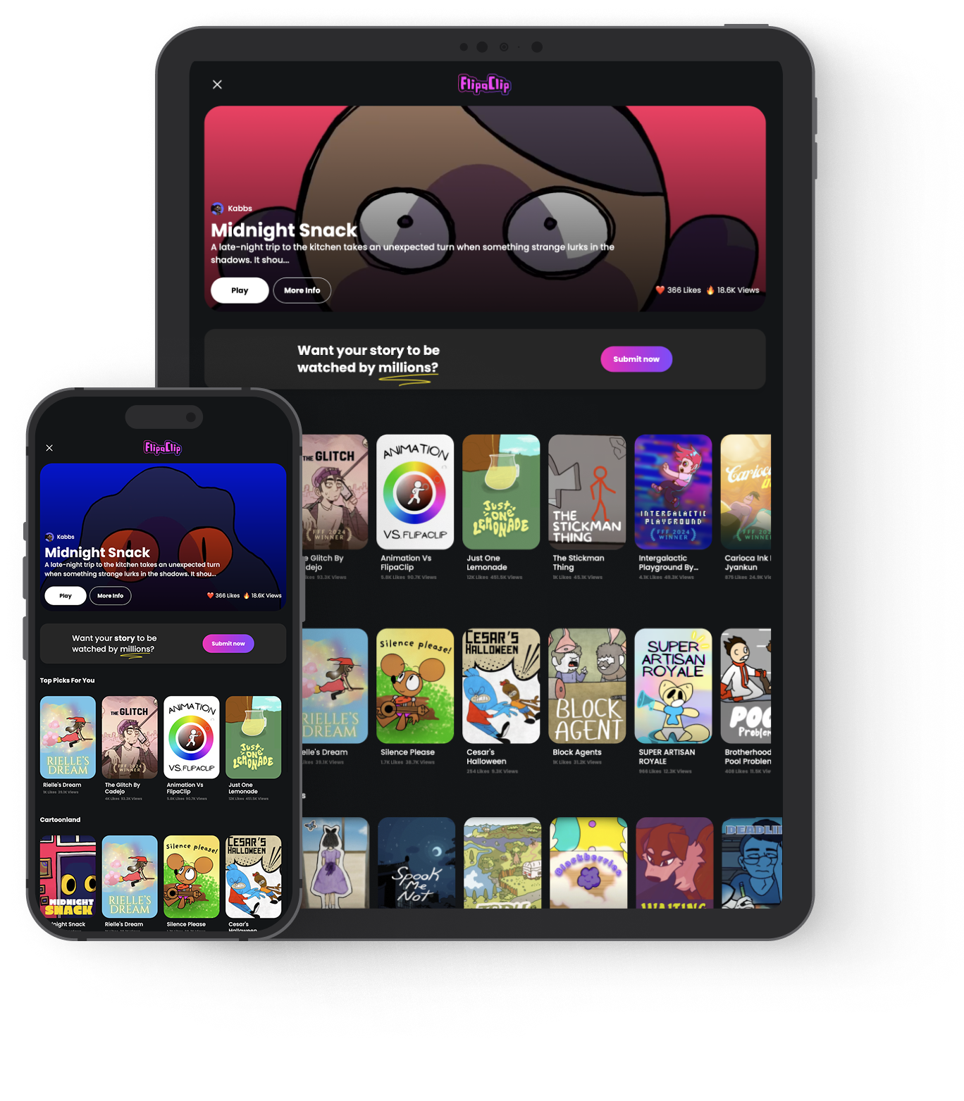 A space where millions of animation fans eagerly discover bold and original stories, unfiltered and directly from the minds of emerging artists. Pure creative vision, frame by frame.